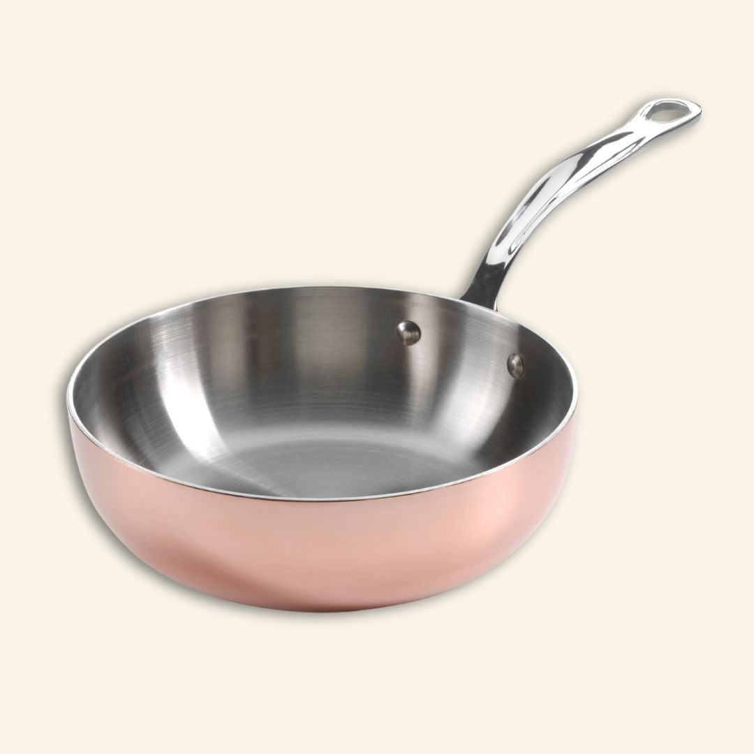 Inspired by the design of traditional European chef pans, this copper induction chef pan is an essential element of every kitchen arsenal. This elegant, high-sided pot can be used to prepare an entire meal with ease. With a copper exterior that looks as good as it cooks, this elegant piece is at home on any kitchen countertop.