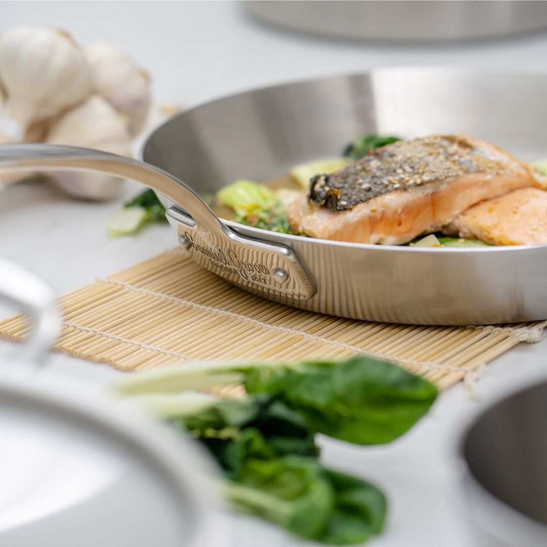 Samuel Groves' stainless steel cookware is designed to look sleek, modern, and of course - gorgeous on your stovetop. Constructed utilising a 3-ply design, this cookware provides an optimal cooking experience that is both durable and beautiful. The three layer construction features an aluminium core throughout both the base and sides of the pan to conduct heat quickly and evenly, while the interior and exterior are made from stainless steel which utilises an elegant brushed finish to add to the modern look of your kitchen, and makes cleaning quick and simple. The combined thickness of 3mm provides a perfect balance between durability and weight, making these pots and pans highly resistant to warping or denting.